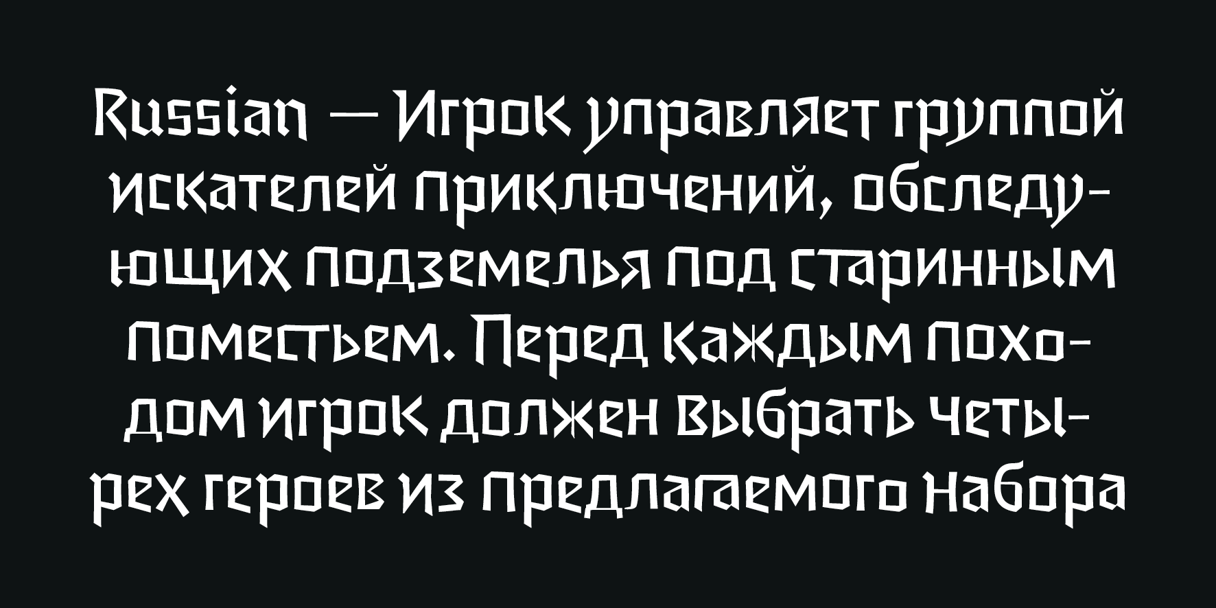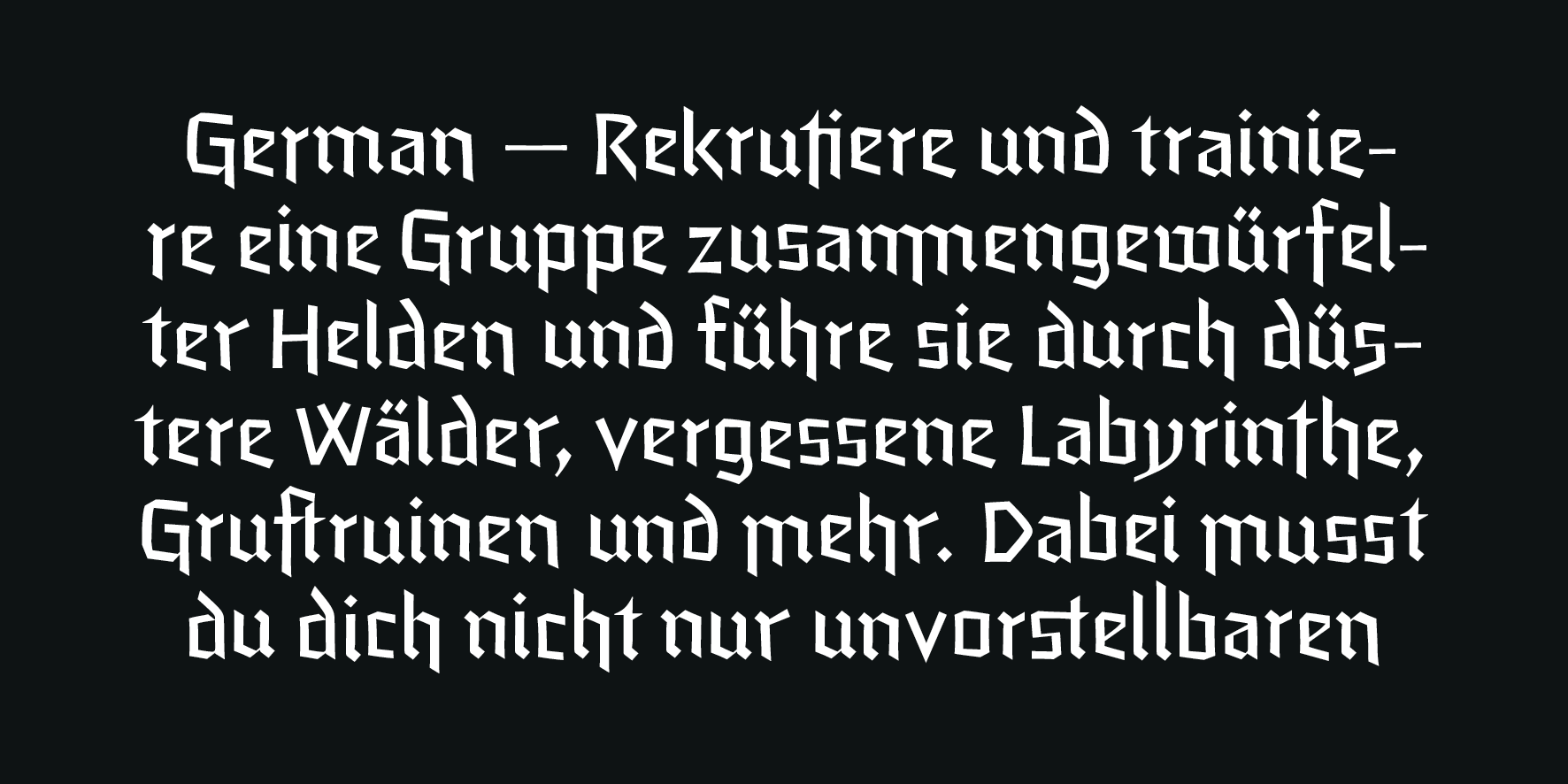 A unique feature of this typeface is the stylistic axis from plain to flourishing initials. Depending on the length of the text there is an appropriate choice. For example a long format text should be relatively plain and simple, while titles should have some flourish to draw attention. Location or character names can even be wider and more ornate.